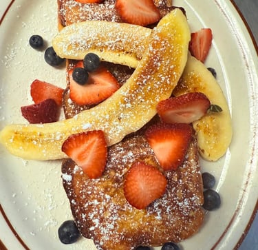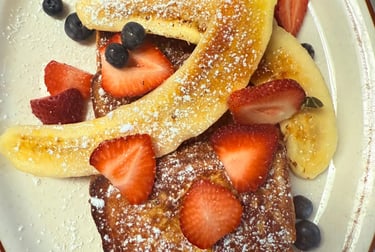 3 pancake tortillas filled with strawberries, dried mango, banana, whip cream, sprinkles and a side of home fries