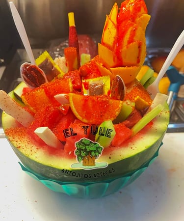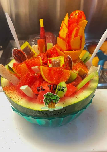 Large portion of mixed fruit, home made sauce, topped with pepino loko, peanuts, mexican candies and lime