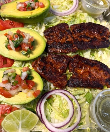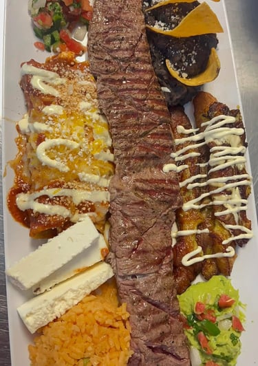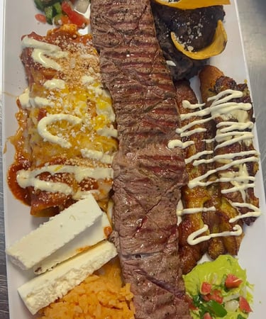 Fried Pieces of tortilla covered in red or green salsa, topped with cilantro, onions, cheese, sour cream, eggs, and meat of choice (Chicken $15) (Steak $16) (Mixed $18)