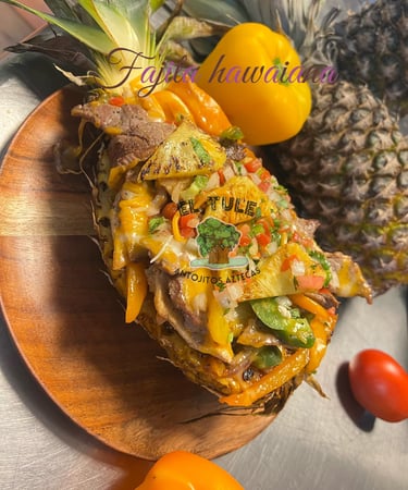 Comes with chicken, steak, green and red peppers, onions, cheese, pico de gallo, served on half of a pineapple