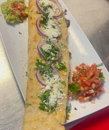 Double tortilla filled with beans, rice, meat of choice, sour cream, pico de gallo, and mixed cheese