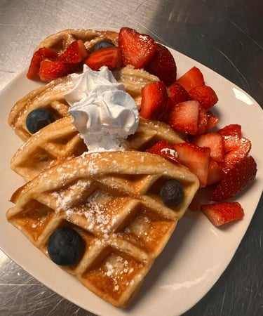 Waffle sandwich with mexican omelette inside, sided with fruit in season